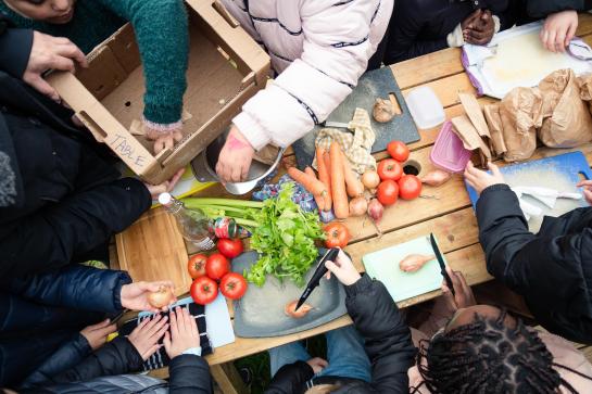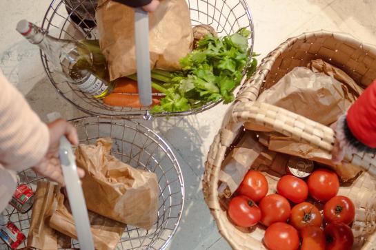 Als de ogen zijn gestopt met tranen ('Die ajuinen prikken!') staat er aan de ene tafel een lege afvaldoos. De andere tafel, bij de leerlingen die hun inkopen in het klassieke warenhuis hebben gedaan, heeft inmiddels een doos boordevol wegwerpplastic verzameld. Het verschil is overduidelijk.