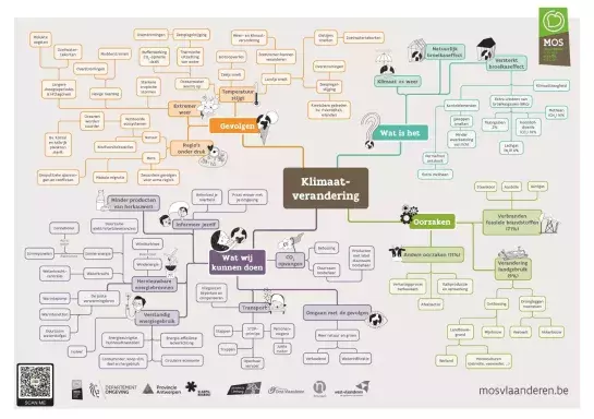 Geef het klimaat een plaats in je klas. Hang de MOS Klimaatmindmap op in de klas. Praat over het klimaat met je klas, bijvoorbeeld met de kaartjes van ‘klimaatburgers’. Vertel het verhaal ‘Terra is Ziek’ aan de hand van de KaMOShibai.