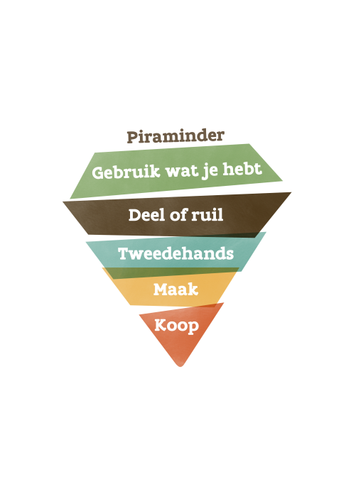 De Piraminder daagt je uit om na te denken of je wel echt iets nieuws nodig hebt. De verschillende delen verbeelden een consumptiehiërarchie, een stappenplan voor het vermijden van aankopen. Als je op het punt staat om iets te kopen, volg dan de stappen van boven naar beneden.