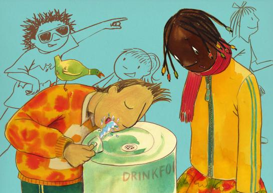 Alida is new in class. She has just come to live in our country. She has come by plane from Kenya with her parents. In their region, it has become very dry and there is a fight about water. Alida stares wide-eyed at Bilal who is drinking greedily from the drinking fountain. The children in the class do not understand this. Teacher Lut is talking about Alida's region and explains that being able to drink water is not obvious for everyone. Bilal says that some children in Morocco have to work hard to get drinking water. Sofie, Dylan and Bilal don't think it's fair that not everyone in the world can drink delicious water. They provide a gift for Alida.