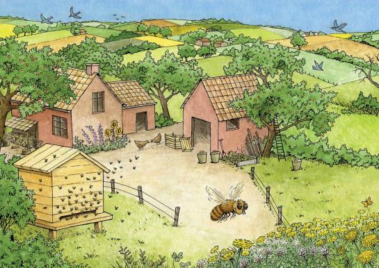 - Picture 1: where are we? How can you tell this is an apple farm? Are there flowers/blossoms on the apple trees? Why is there a ladder against a tree? What animals do you see on and around the farm? Where is Bee's house? Why do you think this is Bee's house? Is it an ordinary house or a closet?