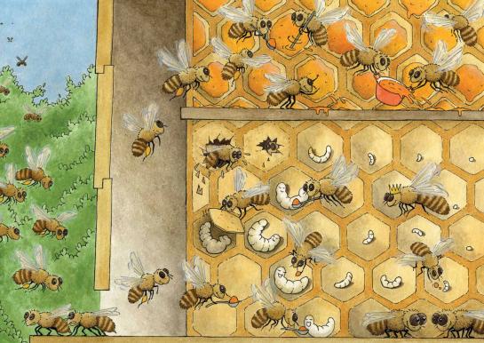 - What happens in the lower part? Do you see the queen? What does the queen do? Do they actually use a spoon in real life? What does a larva eat to grow? How many 'walls' do bee's tiny houses have?