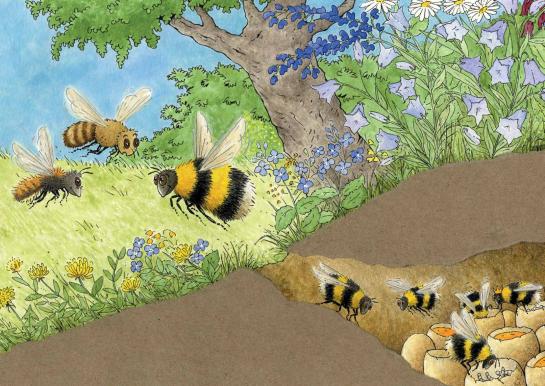 - Picture 8: where is Bumblebee's house? What (external) differences do you see between Bumblebee, Lony and Bee? What do you see in the surroundings of the nest? → many flowering plants. Do you see the queen? What are the queen and workers doing? Where have you seen that before? → in Bee's closet.
