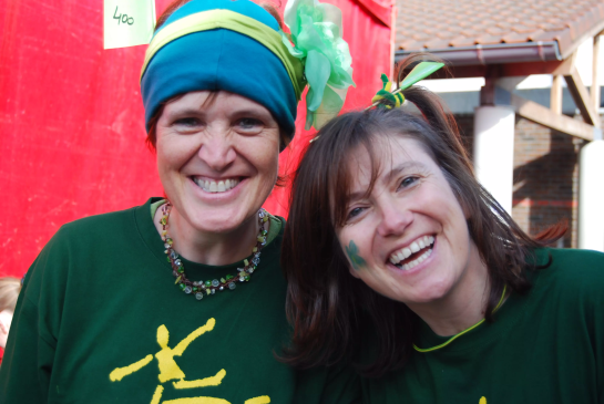 - kleurde groen (vaste planten in bloembakken, groene hapjes en drankjes, groene kledij, door ouders gemaakte vlaggenlijnen uit reststofjes);